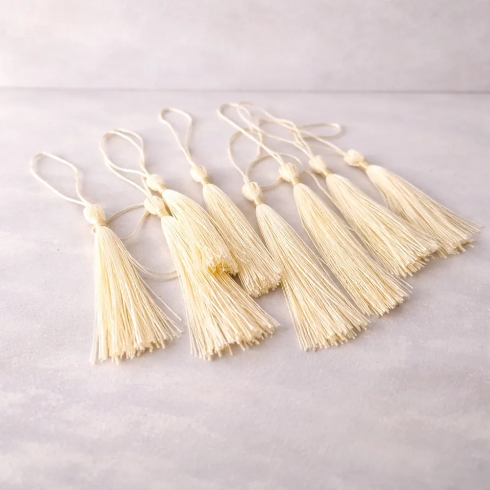 Están disponibles en dos versiones: con o sin borla de hilo blanco, lo que permite adaptar el estilo a bodas más clásicas o modernas, según la ambientación y gusto de los novios.