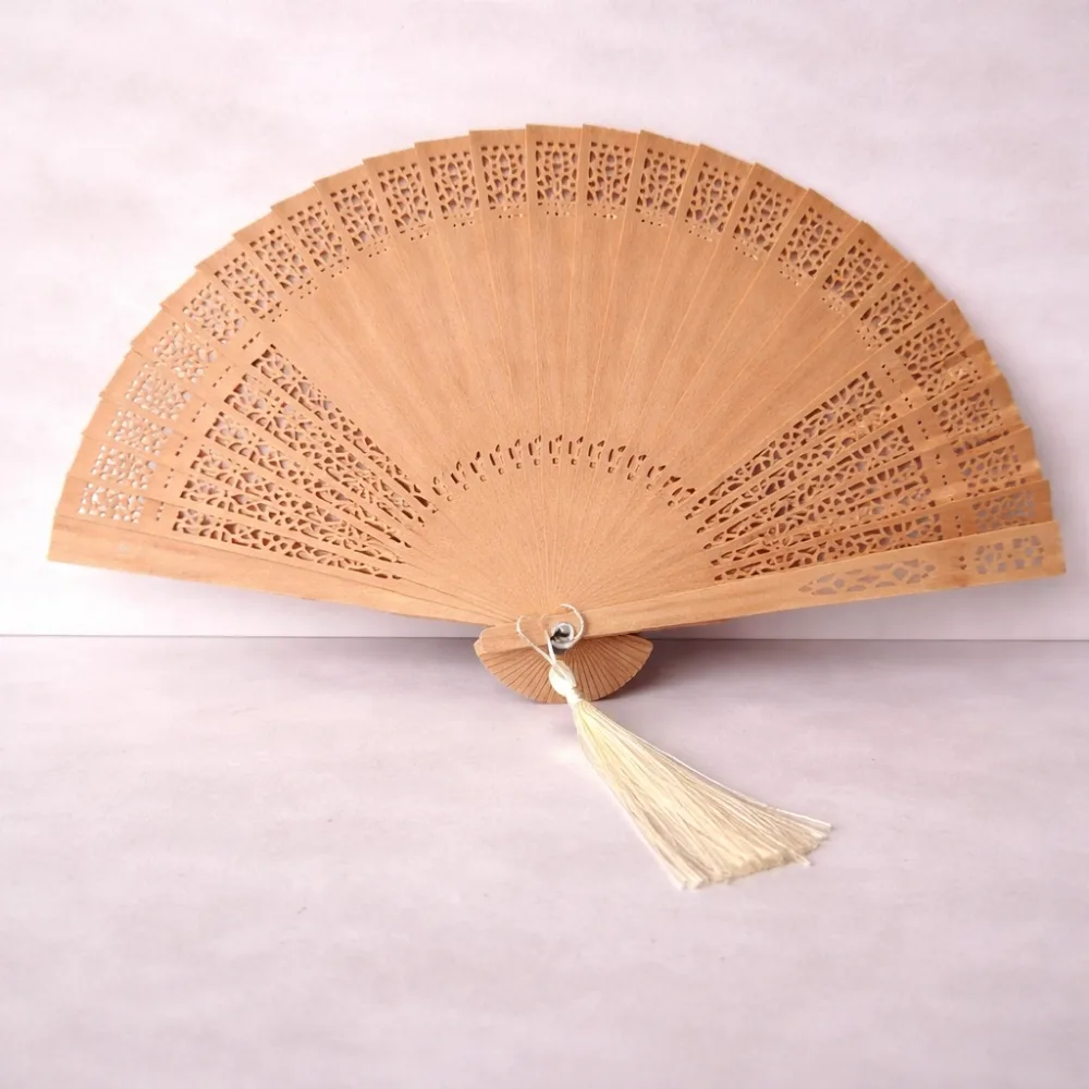 Abanico de madera con bonitos dibujos calados, ideal para bodas con estilo.