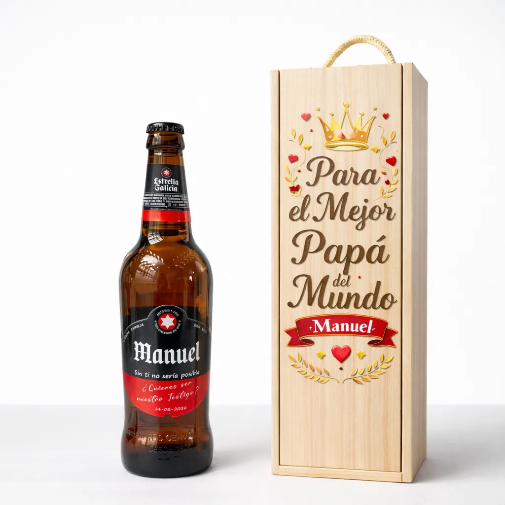 Esta Cerveza Personalizada con Caja para Padres está creada para convertir un momento cualquiera en una ocasión especial. No es solo una botella: es un mensaje, un nombre y un recuerdo presentado de forma cuidada en una caja de madera premium. Ideal para padres que disfrutan de una buena cerveza y que valoran los detalles con significado. ✨