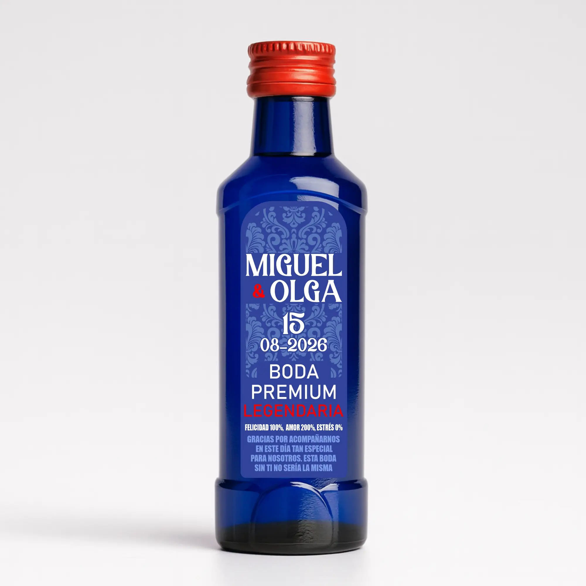 Una vez nos envíes los datos, adaptaremos la maquetación a la forma de la pegatina y al espacio disponible para que el conjunto quede equilibrado y legible sobre la mini botella.