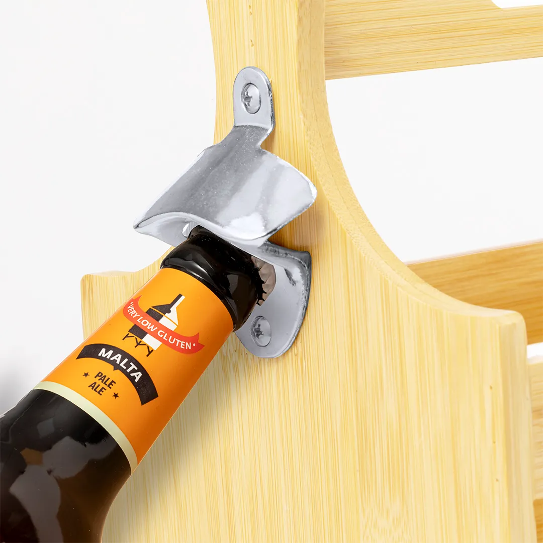 No tienes que añadir nada extra: el portabotellas incluye un abridor de botellas metálico integrado en uno de los laterales, listo para usar.