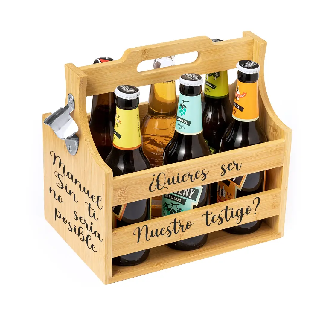 Este Portabotellas Personalizado es ese regalo diferente que combina utilidad, diseño y un toque muy especial gracias a la personalización. Fabricado en bambú y con forma de caja de transporte, te permite llevar y presentar tus bebidas de forma cómoda y con mucho estilo. ✨